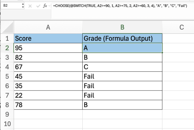 Let’s say you want to grade scores into A, B, C, or Fail by using the SWITCH function to determine the correct category based on score ranges and then using CHOOSE to return the corresponding grade label.