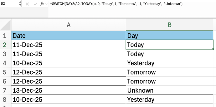 To understand how SWITCH works alongside other functions, imagine you have a list of dates and want to quickly identify whether each one is today, tomorrow, or yesterday. In this case, you can use the TODAY() function, which returns the current date’s serial number, together with the DAYS() function, which calculates the number of days between two dates. Combining these with SWITCH allows you to classify each date at a glance.