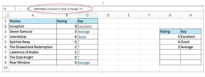 =SWITCH(B2,5,"Excellent",4,"Good",3,"Average","?”)