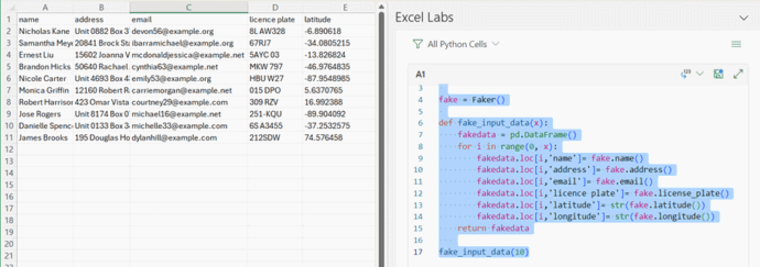Another, more powerful option is the Faker Python library. If your Excel 365 supports Python, it’s a powerful way to drop a table of fake data into a worksheet.