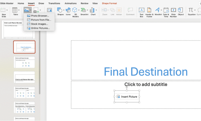 PowerPoint offers options to insert a picture—from your computer, depending on what’s available in your version. To use one, open your presentation, go to Home | Layout and select a layout that includes a picture placeholder (you will see a little picture icon inside the box).