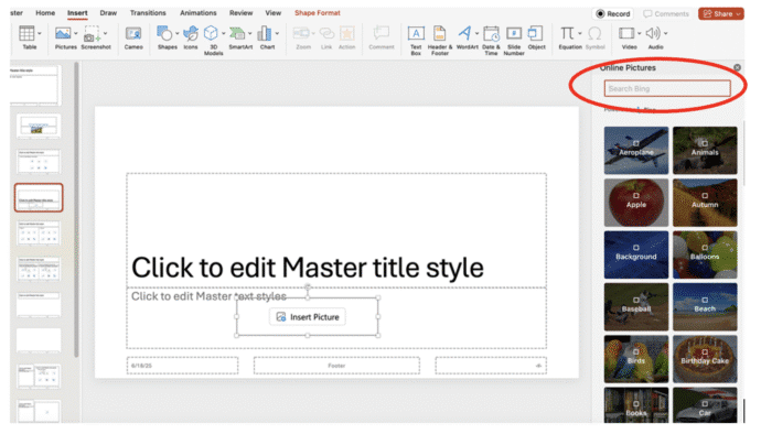 To insert an online picture, click on Online Pictures. A Bing search box will appear—type something like “animals” to look for images. Select the one you like, then click Insert to add it into your slide.
