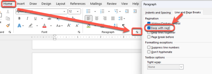 - In the Paragraph dialog box, head to the Line and Page Breaks tab.