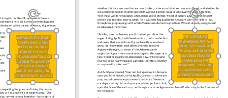 All the text will automatically flow between the boxes as needed, for example if you change the text inside the boxes or change the size of the text boxes. No cut/paste or juggling of text required.