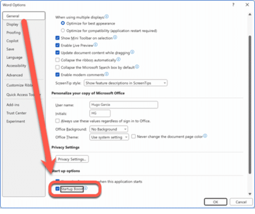 - Startup Boost is enabled in Word 365 File | Options | General | Start up options | Startup Boost.