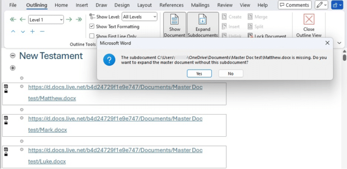 Is there a way to use Microsoft Word’s “Master Document” feature with OneDrive? No, but only because Microsoft won’t fix it.