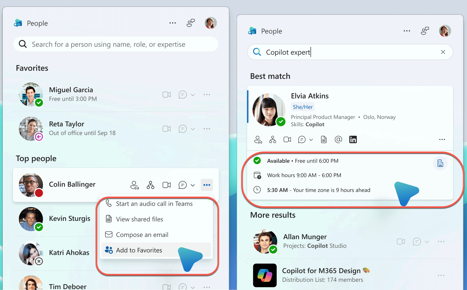Use People to quickly look up coworkers, their availability (below, right) or start a chat/email/call (below, left).