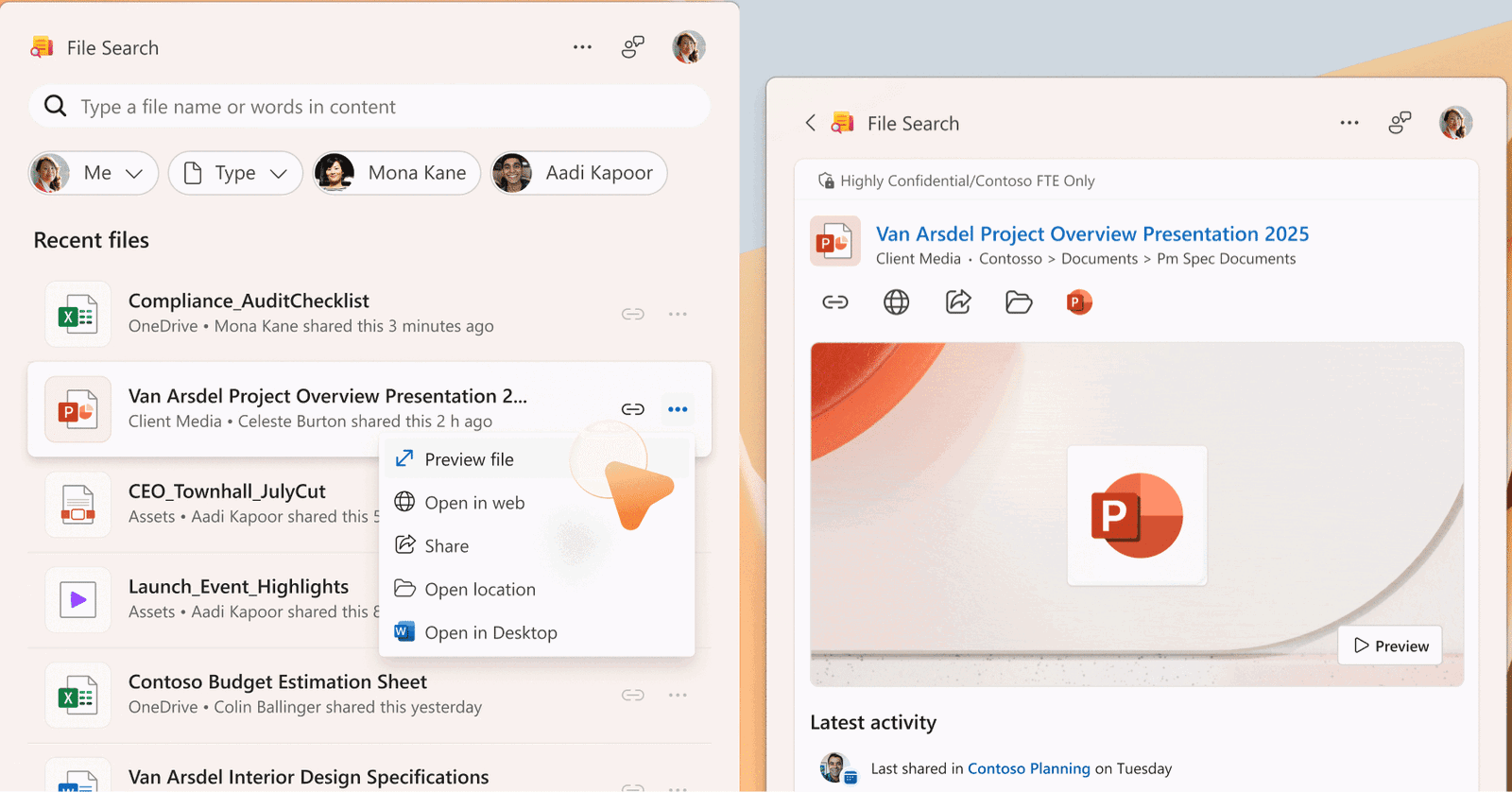 Search across OneDrive, SharePoint, Teams, and Outlook for recent or specific files; filter, preview, and share—again, all from the taskbar.