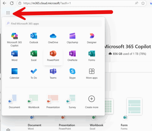 Click on the ‘nine dots’ icon at top-left to see the web apps available including Word, Excel and PowerPoint.
