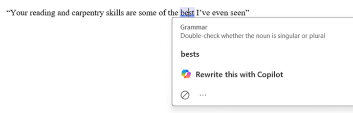 But if there are words it’s unsure of, Word will issue a warning. This sentence switches back to the “bests” suggestion because Word isn’t sure if ‘carpentry’ is singular or plural.