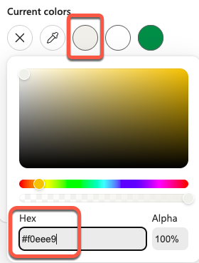 In Microsoft Designer, scroll down the color selector pane to find the Hex and RGBa code fields.