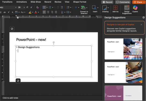- Only Microsoft 365 plans with some form of Copilot (not Classic plans) have Design Suggestions.