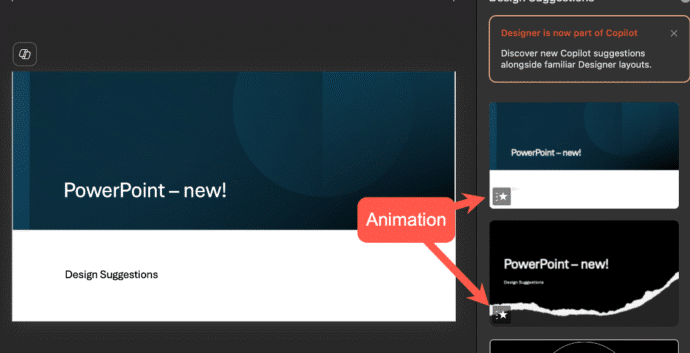 “Design Suggestions” replaces “Designer” which has been in PowerPoint for the last few years. The new AI replacement is called “Slide Starters,” in Microsoft promotion but “Design Suggestions” on the ribbon … go figure.