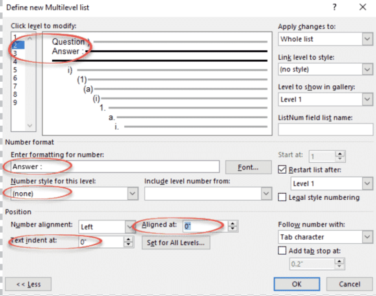 Answer could be a separate multilevel list style but it’s probably easier to make it the second level of the same list style. If you wish, change the Aligned and Text indent so it’s aligned with Question, instead of the default indenting.