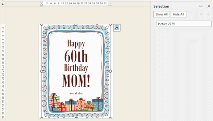 For one test, in Word all you get is a single full-page image that’s useless for any kind of editing in Word. The text, graphics and border in one block, see the single Picture element in the Selection Pane at right.