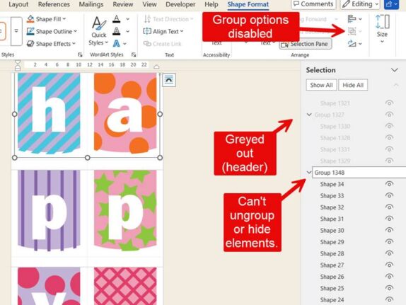 Some groups in the Selection Pane are greyed out because they are based in the Word document header. Open the Header (Insert | Header | Edit Header) and those groups will appear in the Selection Pane.