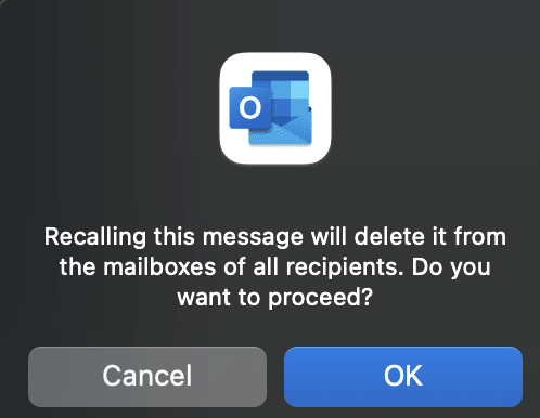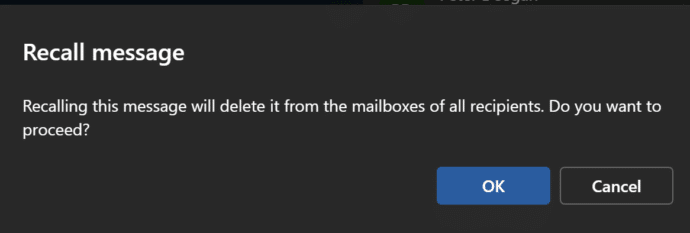 Then there’s a warning message which doesn’t tell the whole truth. Recall will not delete the message for ALL recipients — only the ones with a compatible mailbox.