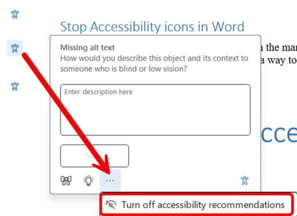 Uncheck the box ‘Show me options for creating accessible documents’ which is Microsoft corporate speak for ‘Show Accessibility icons in margin’.