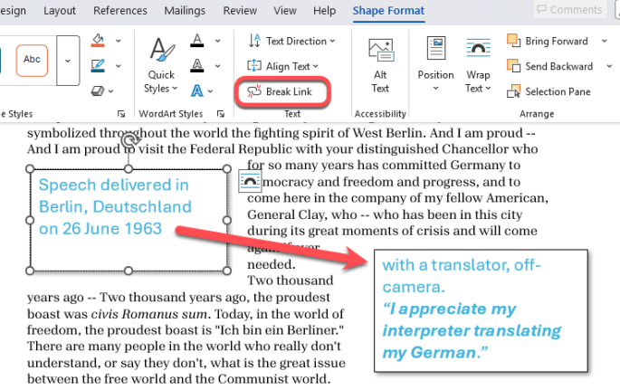 In Word there’s just a small ‘Create Link’ button on the Shape Format ribbon. Nothing on screen to show that text boxes are linked, aside from the “Break Link” button on the Shape Format tab.