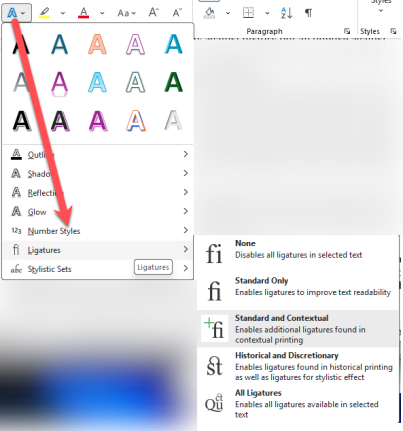 Publisher has a Typography button on the Text Box ribbon which shows additional text formatting options like Drop Caps, Ligatures and Stylistic Sets.