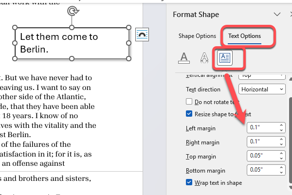The nearest equivalents in Word are at Format Shape | Text Options | Layout & Properties but these change the text box to fit the text.