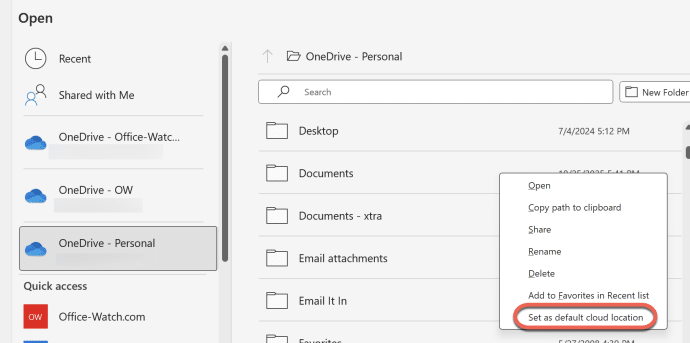 In File | Open, find the cloud folder you want, right-click and choose “Set as default cloud location”.
