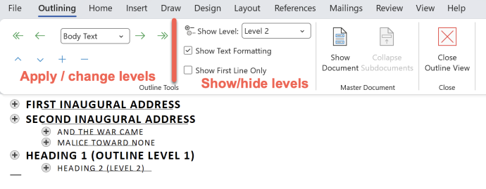 In Outline View opens a new tab “Outlining” with a large section called “Outline Tools” which isn’t very clear because it’s really in two parts. On the left there’s options to change or apply headings (outline levels) on the right changes what you see in Outline View.