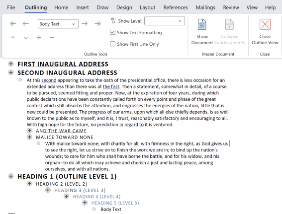 OK, OK, that last paragraph isn’t entirely true. Outline Levels control what you see in Outline View. Heading styles (Heading 1 etc.) are usually aligned with matching Outline Levels (Level 1 etc.) but they don’t have to be. See Why Microsoft Word Headings Often Don’t Work the Way You Think (Understanding Headings vs. Outline Levels)