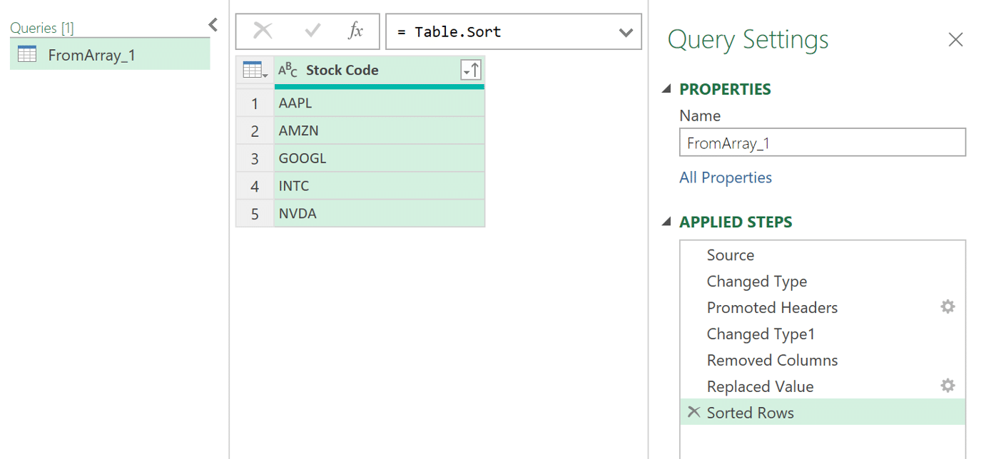 Now add whatever other steps you like.  We’ve removed the Company Name column, because we only want the Stock Codes.  Also replaced Microsoft with Intel (INTC) just to demonstrate how PowerQuery can be setup to add/delete or change specific data.