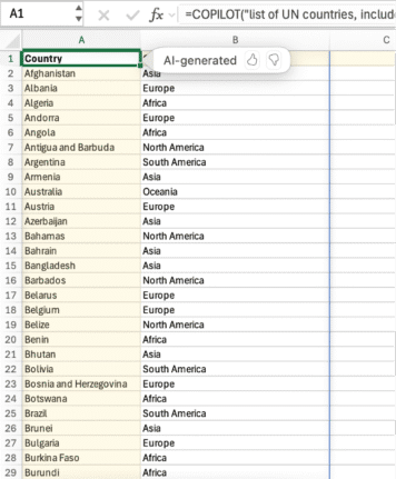 =COPILOT("list of UN countries, include headings","Only countries that start with the letters A or B, show short name and continent")