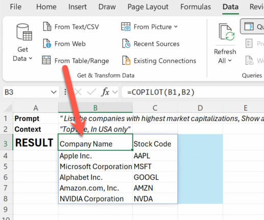 • Some Excel features, like Stock data, won’t work with a dynamic array source that Copilot() often returns.  An interim step is needed to make Copilot() play nice with other parts of Excel.