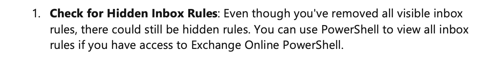 Get-InboxRule -Mailbox youraddress@example.com can help uncover any rules not visible in the standard settings.What Microsoft needs to do