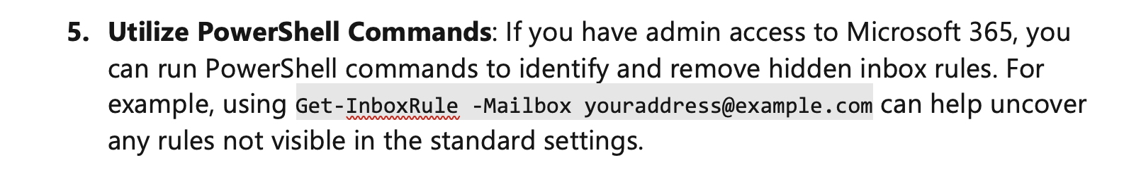 Here’s some ideas for what Microsoft should do to improve mailbox security by easily detecting and removing hidden rules.