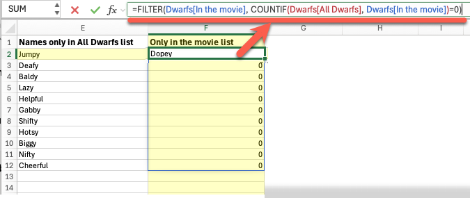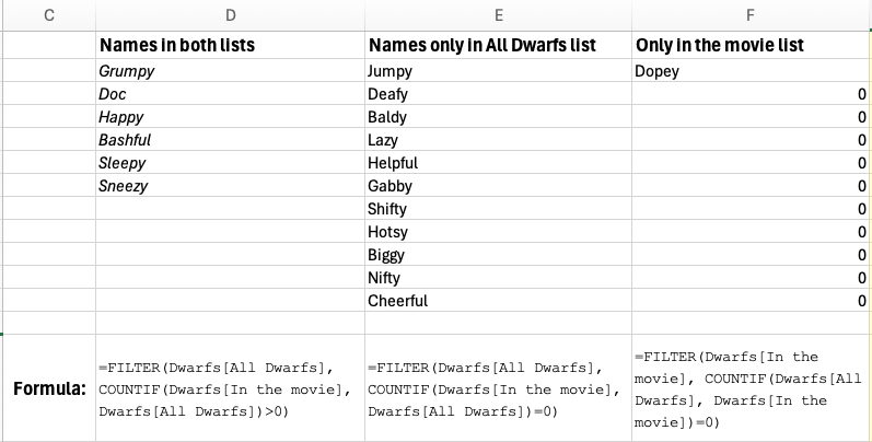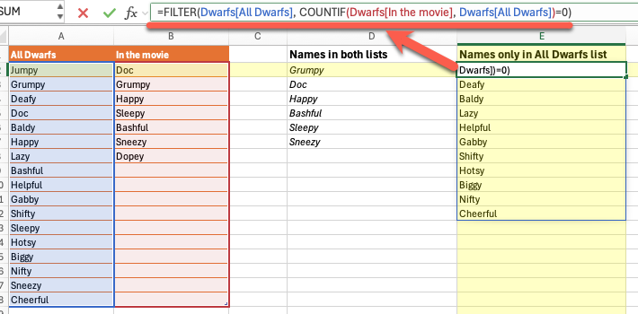 =FILTER(Dwarfs[All Dwarfs], COUNTIF(Dwarfs[In the movie], Dwarfs[All Dwarfs])=0)