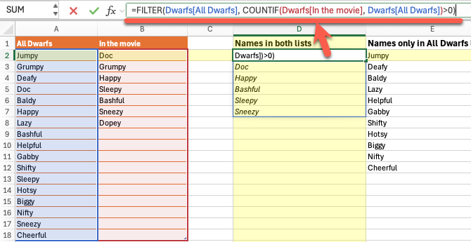 =FILTER(Dwarfs[All Dwarfs], COUNTIF(Dwarfs[In the movie], Dwarfs[All Dwarfs])>0)