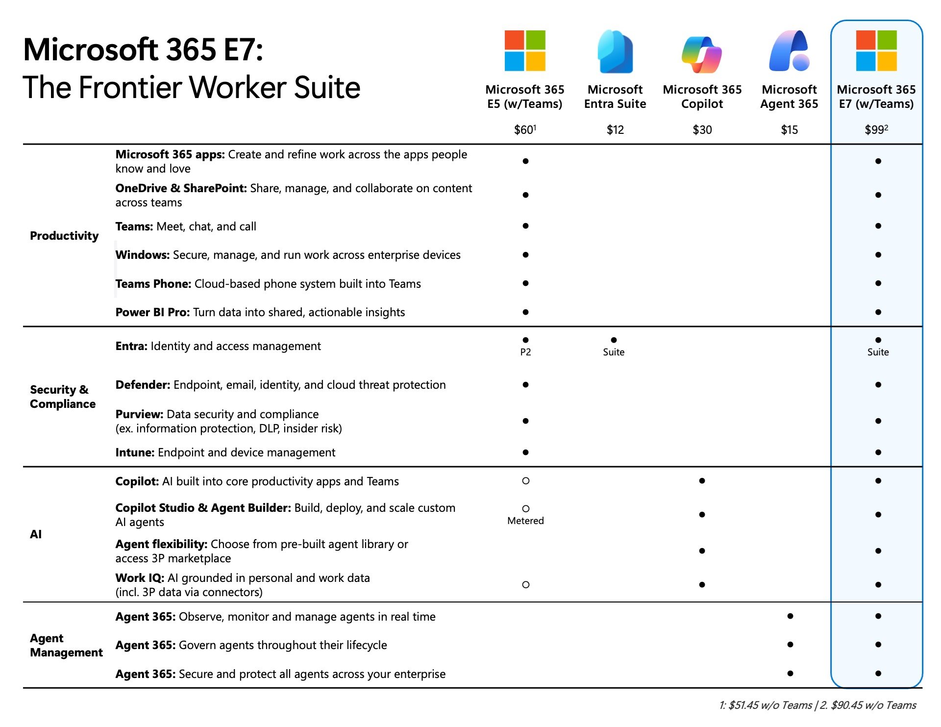 E7 combines Microsoft 365 E5, Microsoft 365 Copilot, and Agent 365 into a single solution, and includes the full Entra Suite along with advanced Defender, Intune, and Purview security capabilities.