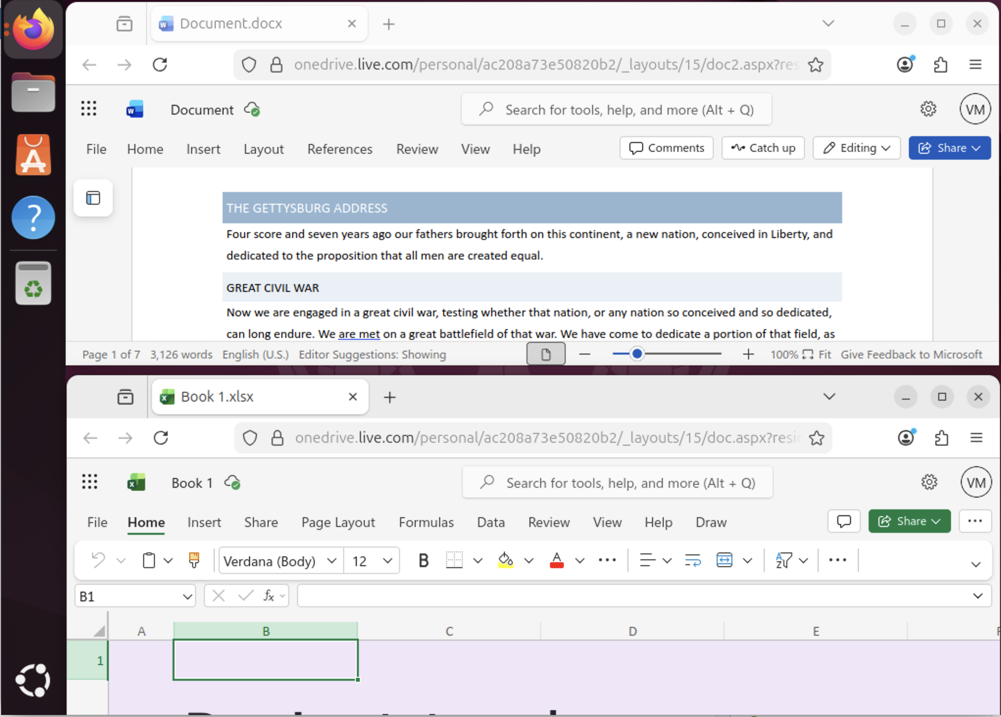 Here’s Word and Excel online open with the Firefox brower that comes “out of the box” with Ubuntu v24.