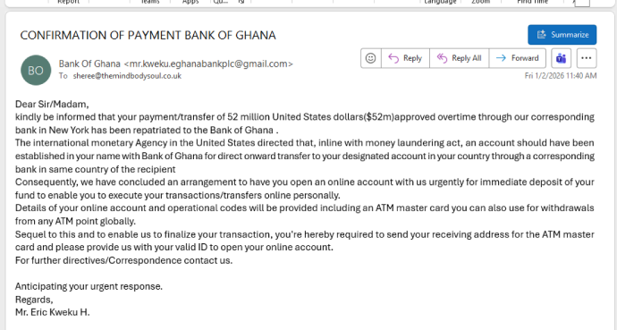 Our 2026 Inbox started with a ‘blast from the past’. An email ‘from Africa’ promising untold riches in exchange for bank details and ID.  This arrived in our Microsoft enterprise hosted mailbox.