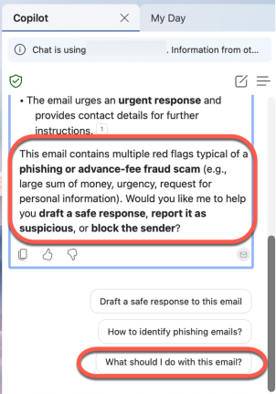 The same message and Copilot access in Outlook for Mac gave a better answer in a Chat pane and asking for a summary. After a summary of the email came a proper warning and suggested actions.