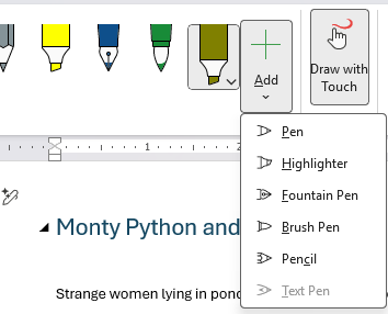 The Highlight Color button on the Home tab is fine for quick work, but it gives you only 15 colors and no control over the pen tip size. The Draw tab’s Highlighter pen seems like a different tool entirely but once you choose the right setting, it works like the standard Home tab Highlight but with a LOT more color choices