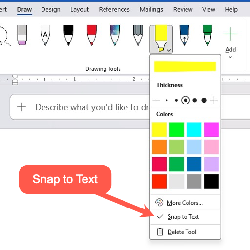 When Snap to Text is turned on, Word automatically adjusts your freehand stroke so the highlight aligns cleanly to whole words or lines, even if your mouse drag was not perfectly accurate. Think of it as autocorrect for your highlighting aim.