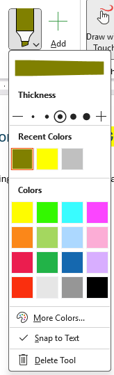The same dropdown panel shows a thickness slider or size options. A thicker tip is better for highlighting whole lines. A thinner setting works for annotating narrow columns or small text. The Home tab highlighter has no equivalent control.