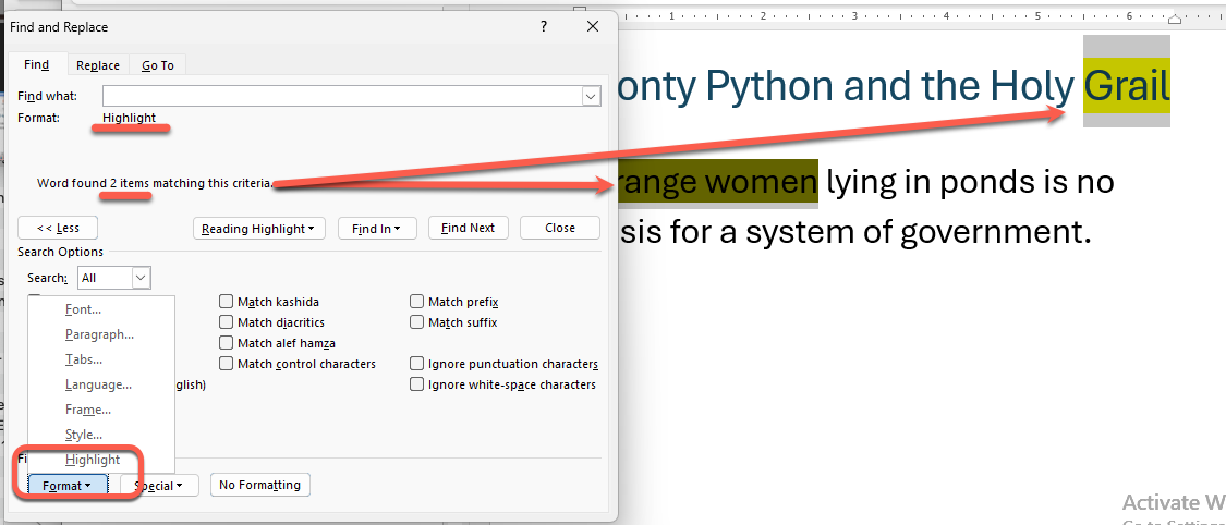 The trick is to turn on Snap to Text for the digital highlight pen. That converts the ‘drawing’ into normal Word highlighting with the useful extras, especially Finding any highlighted text.