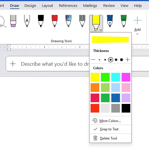 The Draw tab normally treats highlighting as a digital pen stroke rather than a text format. That distinction matters because it means you get the full color picker, adjustable tip thickness, and pressure sensitivity if you are using a stylus.