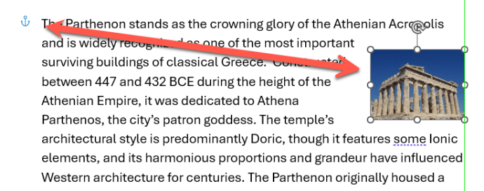 Now you can drag the image around that part of the document. To one side (left or right) or middle, the text will wrap around the image.