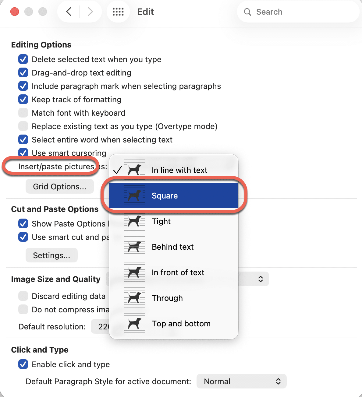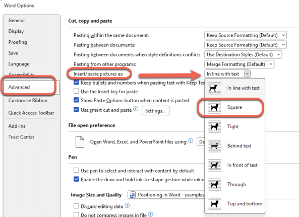 Note: this suggestion is given in some places as a ‘fix’ for placing images in Word. It’s not. Changing the default placement can help because the ‘Square’ wrapping option makes more sense to many people.
