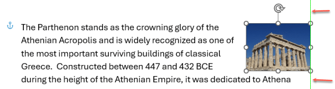 In modern Word (and PowerPoint) look for the green positioning lines that help guide you. In the above example, the vertical green line means the picture is against the right margin of the document.