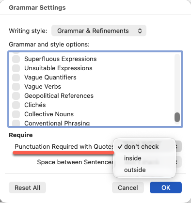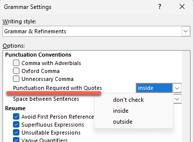 The Punctuation Required with Quotes setting tells Word’s grammar checker which approach to enforce, whether to flag the other style as an error or ignore the whole thing.