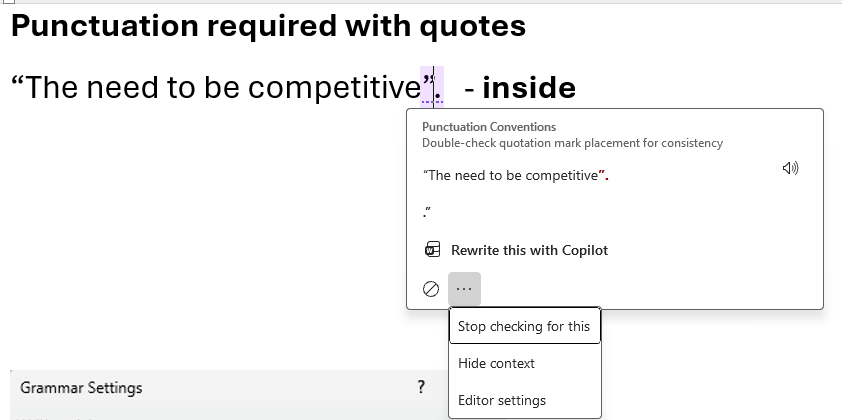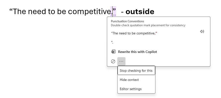 Inside – flags punctuation placed outside quotes as an error (American style). Here’s how this looks when enabled.