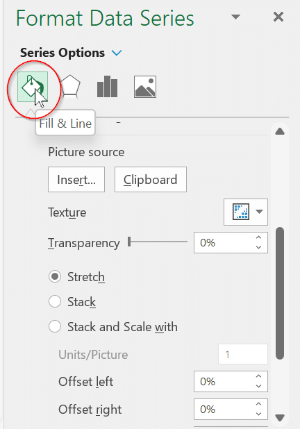 If the image is too stretched out within the area within your graph as shown below, Excel has different ways to format the filled area within the data point.
